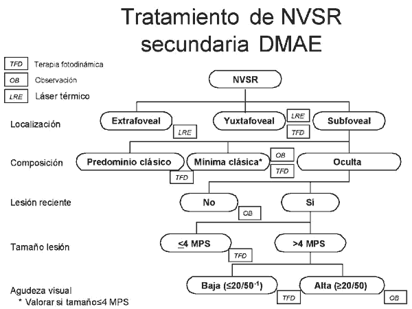 1. Lesión extrafoveolar: lesión bien delimitada a más de 200 micras de la ZAF. Se debe realizar fotoablación con láser argon siguiendo las recomendaciones y parámetros de los estudios MPS.