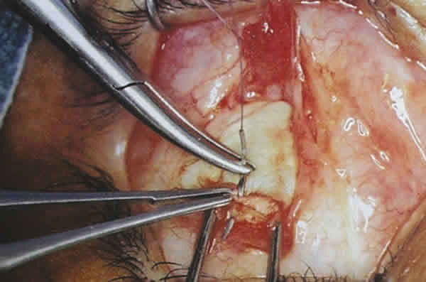 Descrita por Jampolsky en 1979 es uno de los principales avances popularizados en la década de los 80’. Consiste en suturar el músculo con una sutura con doble aguja y formando sobre él una «vainica». Se anuda a la inserción primitiva, dejando una lazada que puede ser deshecha y por lo tanto capaz de modificar la cirugía (fig. 3).