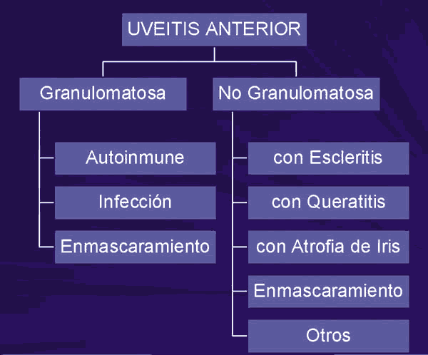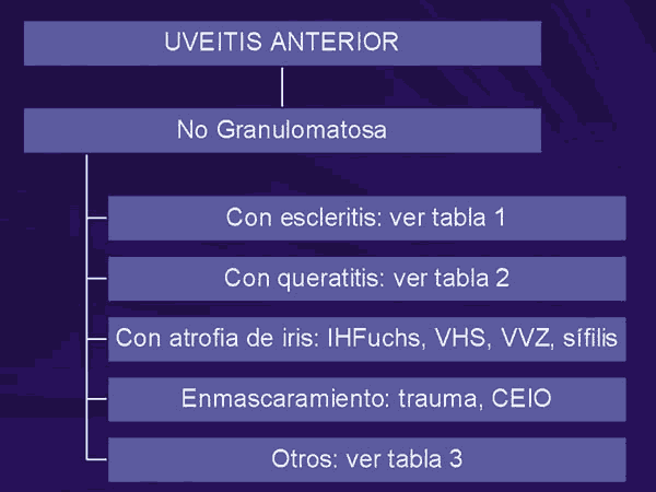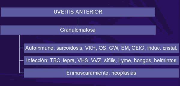 En resumen, la diferenciación de una uveítis anterior en granulomatosa y en no granulomatosa, así como los hallazgos obtenidos en el interrogatorio por aparatos y en la exploración ocular, nos ayudarán a sospechar las enfermedades oculares o sistémicas más probables. Las pruebas complementarias nos ayudarán a confirmar o descartar dichas posibilidades diagnósticas.