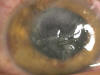 El curso postoperatorio fue inicialmente normal mostrando, sin embargo, percepción y proyección de luz en dos cuadrantes. Dada la imposibilidad de visualizar adecuadamente fondo de ojo por el leucoma cicatricial, se realizó un estudio ecográfico que confirmó un desprendimiento de retina extenso por lo que con el fin de restaurar la transparencia de los medios, que permitiera abordarlo quirúrgicamente, se decidió realizar un trasplante de córnea.