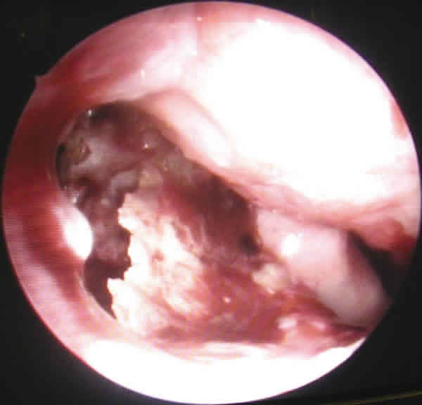 Fig. 2. Visión endoscópica de erosión hueso nasal.