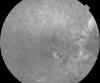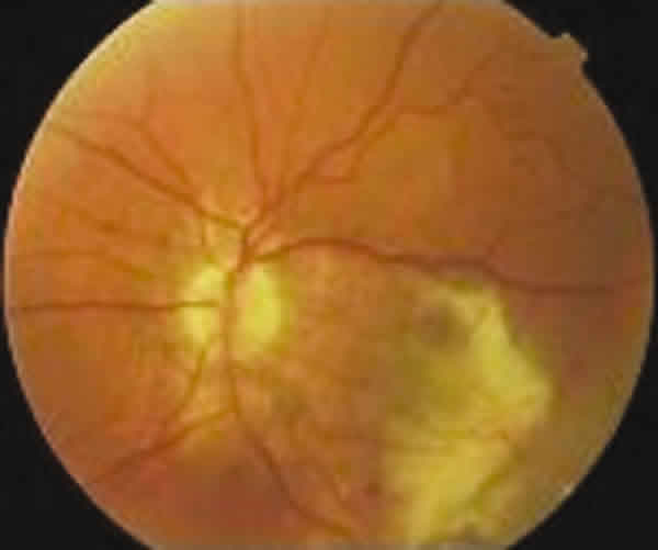 Fig. 4. Fondo de ojo derecho. Lesión grisácea adyacente a zona de la rotura