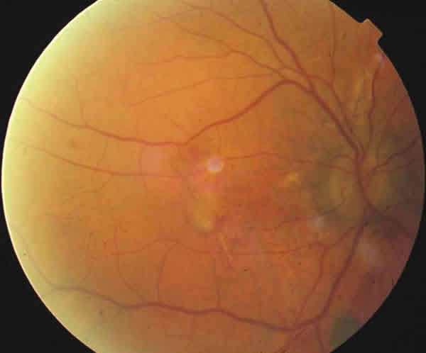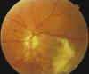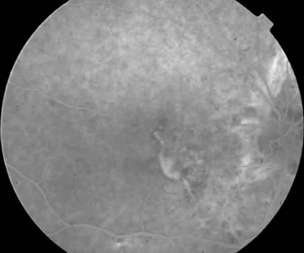 Fig. 2. Fondo de ojo izquierdo. Cicatriz disciforme. Estrías angioides