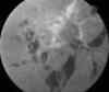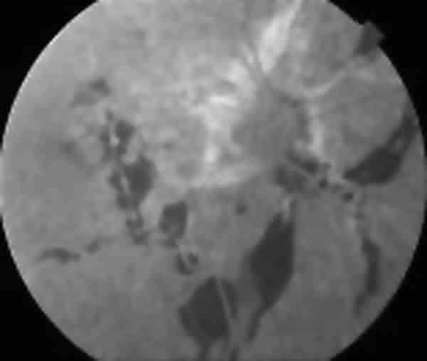 rotura coroidea. Hipofluorescencia a nivel de las hemorragias subretinianas.