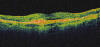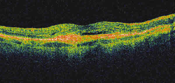 El paciente siguió estrictos controles periódicos del ojo derecho examinándose en cada uno de ellos la agudeza visual y el polo posterior por biomicroscopía, comprobándose la reabsorción progresiva de las hemorragias y mejoría parcial de la agudeza visual hasta 0,4. No obstante, a los dos meses y medio de evolución, en un control rutinario se objetivó una lesión grisácea a nivel yuxtafoveal de su ojo derecho (fig. 4) con un descenso de la visión a 0,25. Tras la realización de una AGF, se comprobó la presencia de una membrana neovascular de aspecto clásico a nivel yuxtafoveal (fig. 5). Se realizó tomografía de coherencia óptica (OCT) que demostró la presencia de la membrana asociada a fluido subretiniano (fig. 6).