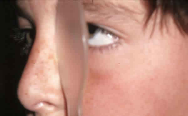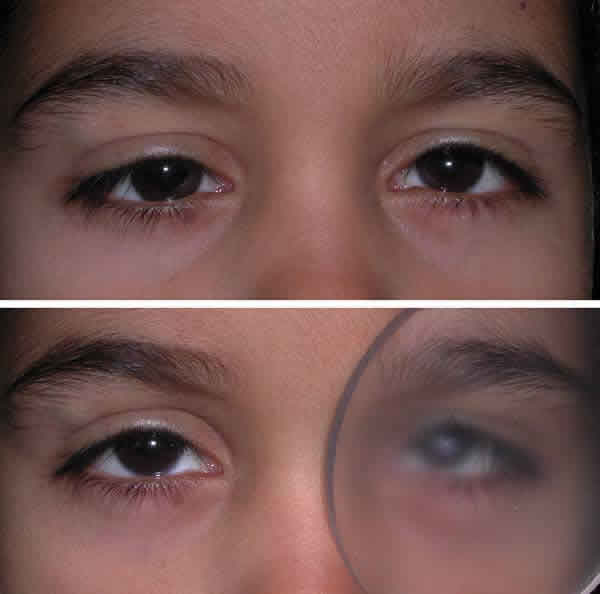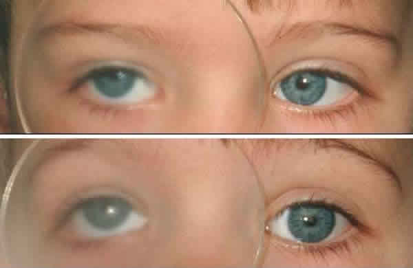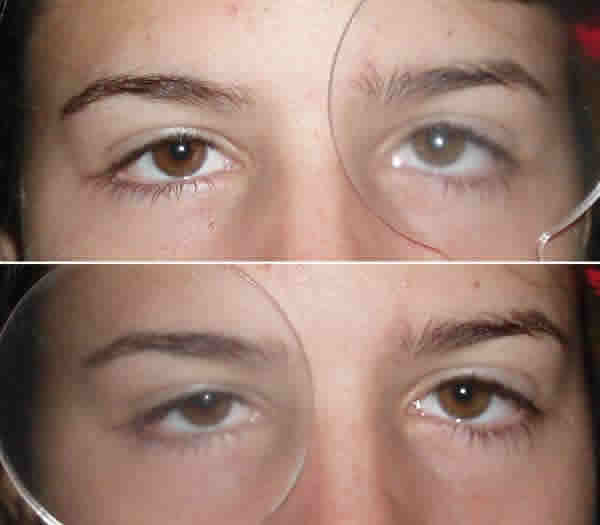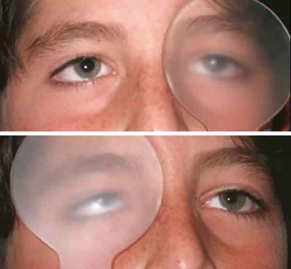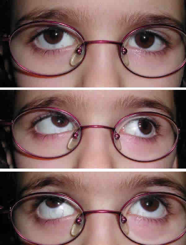 5) Se desencadena ante fluctuaciones del impulso visual binocular, por ejemplo, oclusión de un ojo, rápido descenso de la iluminación ambiental, anteposición de una lente convexa ante un ojo, o de un filtro traslúcido u oscuro, la lateroversión extrema etc. (figs. 3 y 4). Todas ellas son situaciones o maniobras que comprometen y reducen la percepción de la luz y/o de la forma, unilateralmente, rompiendo la fusión. Por el contrario, la desviación suele disminuir o desaparecer con la bifijación y con la convergencia (fig. 5).