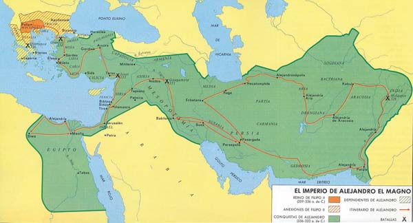 La Grecia clásica se formó en el occidente de Asia Menor, islas del mar Egeo y sur de la península balcánica. Después, entre los siglos VII y VI aC extendió su colonización por el sur de Italia (Magna Grecia, Sicilia) e islas y áreas costeras del noroeste mediterráneo en las actuales Francia y España (Alicante, de Akra leuka —a ´ kra leuka— fortaleza en cumbre blanca; Ampurias y Ampurdán, de ‘empórion —eµpórion—, puerto comercial; Rosas, de rhodes —rodhV—, rosa). En el siglo V aC, tras las guerras medas (Marathon, 490 aC, paz de Cimón, 449 aC), los pueblos helenos se liberaron de la amenaza persa, y alcanzaron un gran desarrollo militar, político, comercial y cultural. En el siglo IV aC, en tiempos de Alejandro Magno (336-323 aC), Grecia alcanzó su máxima extensión, llegando por oriente hasta el río Indo, y por el sur hasta Egipto (fig. 2), y recibiendo y emitiendo influencias de y a estos países y culturas.