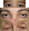 Fig. 17. A: Retracción derecha, ptosis izda.; B: Portadora de prótesis ocular