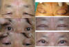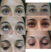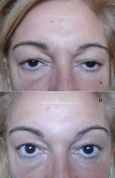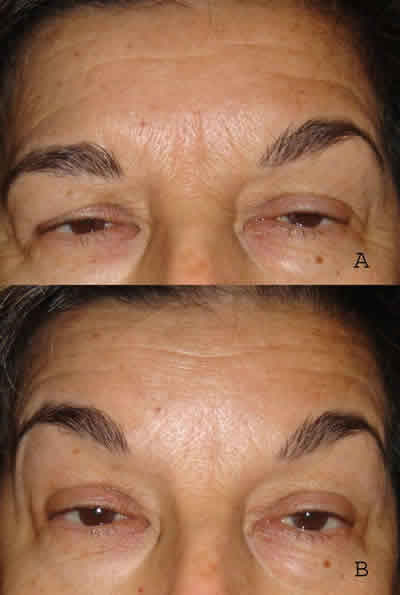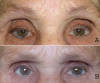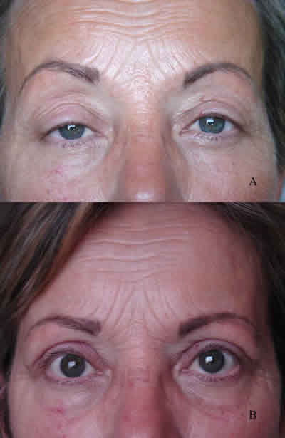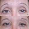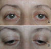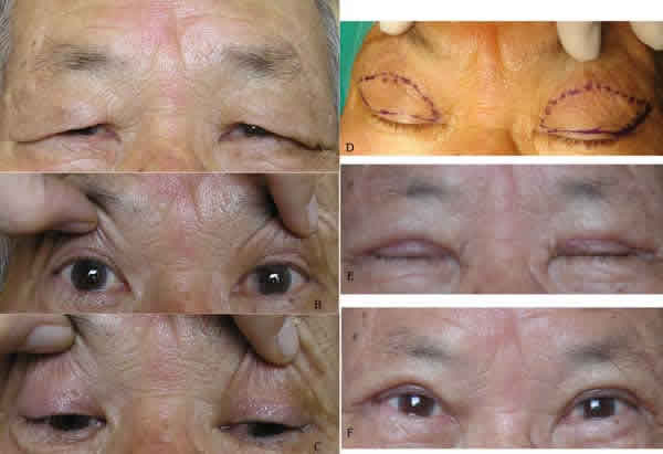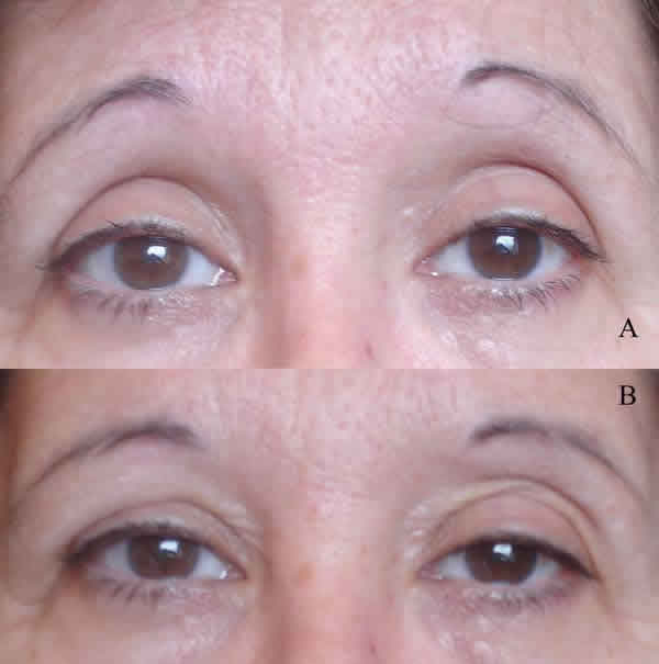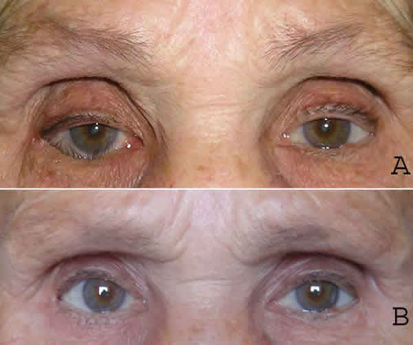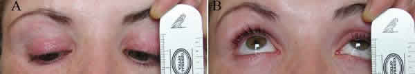 cejas; B: Después de la cirugía se ha normalizado la altura de los párpados y
