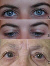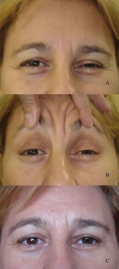 de la frente muy pronunciados; B: Ptosis bilateral al relajar la frente; C: