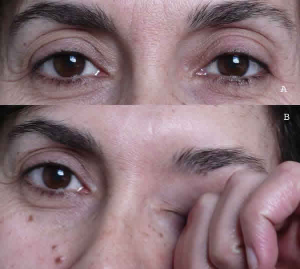 Fig. 15. A: Ptosis que ocluye el eje visual; B: Contracción muy forzada para