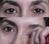 Hay un grupo muy importante de ptosis aponeuróticas que se deben a irritación física de los párpados, (7) como es el caso de los frotadores crónicos, de los usuarios de lentes de contacto y de algunos pacientes que han sufrido cirugía del segmento anterior. El frotamiento de los PS puede realizarse en cualquier momento del día y por causas diversas: al despertarse por las mañanas, con el llanto, con el picor ocular (conjuntivitis alérgicas, dermatitis atópicas y ojo seco), al desmaquillarse o simplemente por costumbre. Nosotros observamos en consulta muchos pacientes que se frotan violentamente los ojos de forma rutinaria y sin ningún respeto a las estructuras palpebrales y al globo. Ellos solos se provocan la aparición de ptosis, y dermatocalasia (fig. 6).