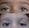 Fig. 25. A: Sospecha de ptosis bilateral, no detectada por los padres, ceja
