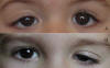 Hace poco tiempo, al hacer una revisión sobre el efecto que puede causar en los párpados el hecho de frotarse de forma mantenida, encontramos en la red vídeos de ecografías tridimensionales donde perfectamente se aprecia cómo un feto se frota insistentemente el párpado derecho (12). Este dato puede justificar también que en el momento del nacimiento ya presenten la desinserción o estiramiento de la aponeurosis, y que la caída del párpado con frecuencia sea mayor en el lado temporal. No es infrecuente detectar ptosis oblicuas (figs. 9 y 10).