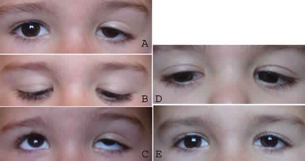 izda. más alta; B: Ptosis manifiesta en ojo izdo. dominante; C: Ptosis latente