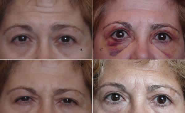 La inflamación excesiva y el hematoma en párpados con aponeurosis previamente debilitadas pueden causar el fracaso de la cirugía. Es útil pautar frío local las primeras 48 horas para disminuir la inflamación postquirúrgica (fig. 37).