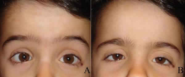 Fig. 39. A: Ptosis moderada desde el nacimiento. Ceja derecha más elevada; B: Ha