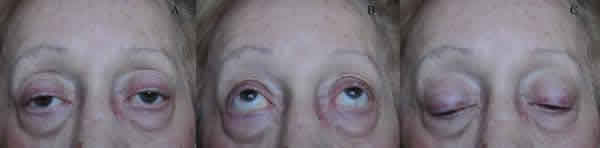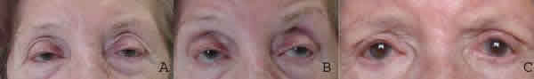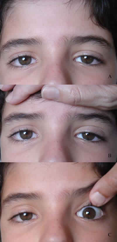 Fig. 36. A: Ptosis izda. B: Surco más elevado; C: Prueba positiva a la