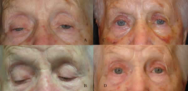 Fig. 35. A: Ptosis derecha leve; B: Excelente función; C: Surco más alto; D: Una