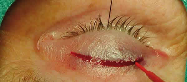 1. Marcado del surco palpebral con un rotulador dermográfico con el paciente sentado y dirigiendo la mirada ligeramente hacia abajo. En ptosis unilaterales se marca a la misma altura que en el lado opuesto. Si la ptosis es bilateral marcamos en la zona central a 8-9 mm del borde palpebral en la mujer y a 6-7 mm en el hombre, y seguimos la línea curva normal del surco.