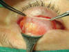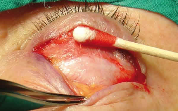 7. Resección de bolsas grasas orbitarias si se encuentran herniadas, teniendo cuidado de coagular los vasos para prevenir el sangrado.
