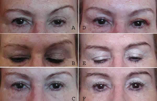 ptosis; B: Ptosis manifiesta al relajar la frente.