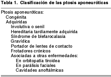 Las ptosis se clasifican, según su etiología, en: miogénicas, aponeuróticas, neurogénicas, traumáticas y mecánicas.