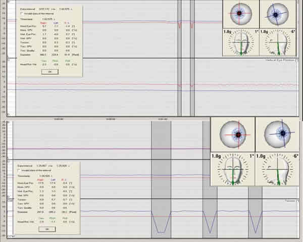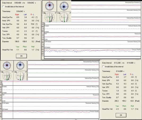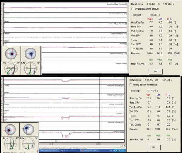 Paciente con parálisis del oblicuo superior del ojo izquierdo.- La VOG-3D nos permite no sólo registrar los movimientos oculares en los tres ejes, sino que a su vez posibilita dicho análisis de una forma conjunta a los movimientos de la cabeza, por lo que es útil para analizar las tortícolis y en este caso el Test de Bielschowsky, donde como podemos ver en este paciente que presenta una tortícolis sobre hombro derecho, se evidencia un menor componente vertical que cuando se realiza sobre el hombro izquierdo debido a la actuación del recto superior izquierdo para compensar la exciclotorsión del ojo, que no puede verse equilibrada en su acción elevadora por la acción depresora del oblicuo superior paralítico (fig. 6).