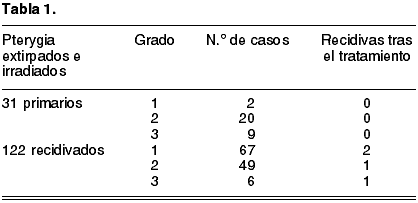 De los 153 pterygia citados, 51 eran primarios y 102 recidivados. Se clasificaron en grado 1: neovasos ligeros e invasión limbal incipiente. Grado 2: neovasos abundantes, invasión corneal inferior a 2 mm (del diámetro corneal horizontal). Grado 3: neovasos abundantes, e invasión corneal de 2 a 5 mm. Grado 4: neovasos abundantes e invasión corneal superior a 5 mm.