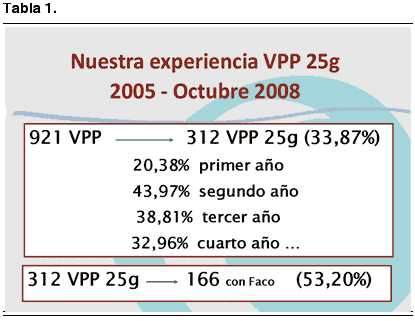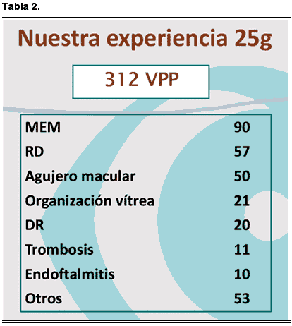 Desde que dos cirujanos en nuestro Centro iniciamos las vitrectomías transconjuntivales sin sutura 25g se han realizado mediante esta técnica hasta octubre-08 312 intervenciones (de un total de 921 VPP) (tabla 1). En un principio, usábamos esta técnica para toda la cirugía del polo posterior retiniano o patologías más anteriores no complicadas; y la mantenemos hoy día a pesar del auge del procedimiento 23g. Para la cirugía macular (membranas, agujeros, edema maculares) consideramos la VPP 25g como indicación prioritaria. En limpieza vítrea por uveítis o endoftalmitis también preferimos 25g por su menor inflamación iatrógena, de igual manera que para apoyo en cirugía de polo anterior como puede ser en implantes de lentes secundarios (tabla 2).