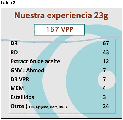 Una complicación que nos preocupa más son las hemorragias vítreas en el postoperatorio por sangrado de las esclerotomías hacia la cavidad vítrea tras las intervenciones, sobre todo en pacientes anticoagulados. Esta complicación infrecuente en 20g por la diatermia previa que se hace en la zona de las esclerotomías, es observada en algunos casos de nuestros pacientes, lo que retrasa la recuperación visual y dificulta el seguimiento. En pacientes en tratamiento con anticoagulantes o antiagregantes es importante pues suspender tratamiento o sustituir por heparina, valorando bien los estudios de coagulación. Cuando la VPP no se puede demorar, por ejemplo en desprendimientos con mácula aplicada, hay que asumir este riesgo además de evitar los capilares más grandes en la punción del trócar y procurar evitar la hipotonía al extraerlos ya que esta contingencia favorece el sangrado interno. Las hemorragias subconjuntivales son habituales en 23g, más que en 25g, y son intrascendentes.