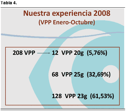 A partir de que el mercado tecnológico puso a nuestra disposición todo el instrumental necesario de 23 g, hemos ampliado nuestras indicaciones con este calibre y es nuestra técnica de elección para la mayor parte de la cirugía que no sea macular, de manera que la mayoría de los desprendimientos de retina, salvo que asociemos un procedimiento extraescleral, son intervenidos con VPP 23g. Ya no existen contraindicaciones por la patología para realizar VPP 23g salvo que se necesite asociar procedimientos extraesclerales como bandas, en cuyo caso ya se necesita abrir la conjuntiva. Pero hasta en estas situaciones es posible mantener el uso de los trócares para minimizar el traumatismo escleral. De igual manera que para extraer un cuerpo extraño intraocular o facofragmentar un núcleo duro luxado se puede usar una apertura de 20g y el resto de 23g. Incluso procesos complicados como DR y RD con VRP, o cuando asociamos implante de válvula de Ahmed, pueden intervenirse con esta técnica. Hasta 167 intervenciones 23g hemos realizado en el período Oct-07/Oct-08, siendo los desprendimientos de retina la principal patología (tabla 3). De todas las vitrectomías realizadas en el año 2008 hasta octubre, la técnica 23g ha supuesto el 61,53%, habiendo pasado la 20g a sólo un 5,76% (tabla 4).
