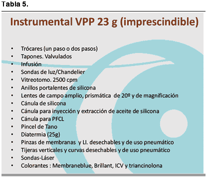 Ha ido mejorando recientemente la cantidad y calidad del instrumental para esta cirugía, existiendo hoy día en el mercado material suficiente para realizar cualquier tipo de procedimientos vitreorretinianos (tabla 5). Dorc, Grieshaber, Millennium y Sinergetics disponen de excelente variedad de productos para nuestras necesidades.