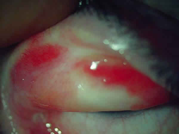 Existe una afectación ocular en el 10% de los pacientes con eritema multiforme minor y en el 90% de los pacientes con síndrome de Stevens-Johnson. La afectación ocular aguda dura de dos a seis semanas. Suelen comenzar como una conjuntivitis purulenta bilateral con edema y/o ulceraciones del párpado. A veces existen ampollas en la conjuntiva y puede haber quemosis. También puede haber una uveitis anterior así como erosiones y úlceras corneales que pueden dar lugar a una perforación corneal. Luego se pasa a un estadio crónico indefinido que en la mayoría de los casos es cicatricial. Puede producirse una fibrosis subepitelial conjuntival (fig. 1) e incluso un simbléfaron (fig. 2) que puede dar lugar a complicaciones posteriores tales como triquiasis, ectropión, entropión, síndrome de ojo seco, lagoftalmos, queratitis por exposición, erosiones y leucomas corneales, queratitis infecciosa, neovascularización corneal, insuficiencia limbar parcial o total, etc. En un porcentaje pequeño de pacientes el estadio crónico indefinido cursa con episodios activos de inflamación que suelen durar entre 1 y 5 semanas; parece ser que pueden ser desencadenados por estrés, menstruación, etc. En estos casos la biopsia conjuntival muestra un depósito de inmunocomplejos en el epitelio y un infiltrado inflamatorio crónico formado por linfocitos T a nivel de la sustancia propia.