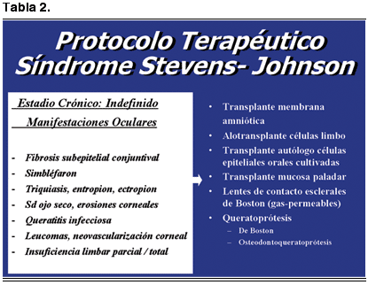 Si existe una insuficiencia límbica total, el alotransplante de células limbares es una posibilidad terapéutica pero los resultados a largo plazo en el síndrome de Stevens-Jonhson son malos a pesar de la inmunosupresión sistémica continua.