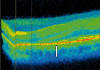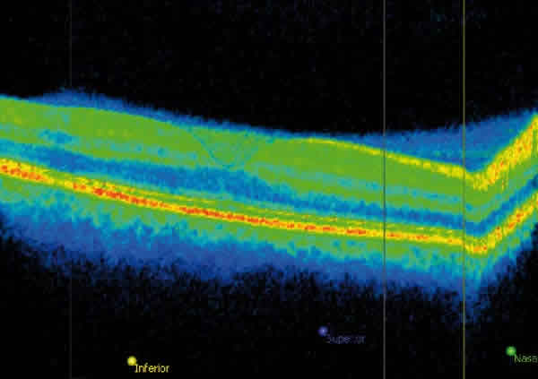 Fig. 4: OCT OI a los 3 meses del debut: Se puede ver mayor adelgazamiento en las