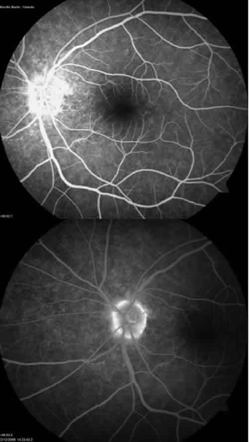 Fig. 5: AFG: Se observa hiperfluorescencia peripapilar por efecto ventana en