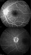 Los potenciales evocados visuales fueron simétricos y sin alteraciones en amplitudes ni latencias. Se realizó OCT de mácula encontrándose un aumento de señal a nivel de la capa plexiforme externa, así como atenuación de la capa de los fotorreceptores a nivel de fóvea, que en la zona nasal llegaba a desaparecer (fig. 3). En la evolución se observó además adelgazamiento de la capa plexiforme externa, más llamativa allí donde el escotoma era más profundo (fig. 4). Se completó el estudio con una angiofluoresceingrafía (AFG), en la que únicamente se apreciaba leve hiperfluorescencia peripapilar por efecto ventana y tinción en fases tardías en OI (fig. 5).