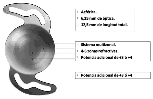 La cuantificación de la agudeza visual monocular se hizo siguiendo la notación de Snellen para todas las distancias y añadiendo la notación de Jaeger para las distancias cercana e intermedia. La satisfacción visual fue sensada pidiendo al paciente que la calificara entre muy buena, buena, regular, mala o muy mala. Se preguntó a los pacientes por la presencia o no de halos en su visión, en caso de respuesta afirmativa se preguntó si entorpecían sus tareas habituales. La lente implantada fue M-Flex 630F (Rayner Intraocular Lenses. Ltd®). Fabricada con un co-polímero acrílico e hidrofílico (Rayacryl®) y con un diseño asférico, refractivo y multizonal (fig. 1). La potencia adicional para foco cercano que utilizamos en nuestro estudio fue de +4. El cálculo de la potencia de la lente se realizó mediante la fórmula SRK/T con la constante 118,5 (Iol Master. Zeiss®).
