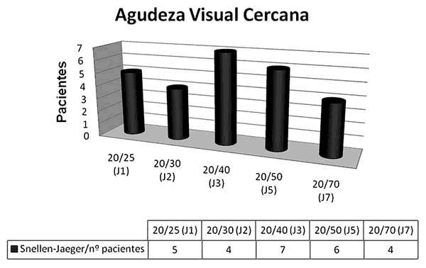 En la distancia cercana los pacientes presentaron una agudeza visual media de 20/40 o J3 (P<0,01) (tabla 4). Los resultados se distribuyeron de la siguiente manera, 9 ojos se situaron entre 20/25 y 20/30 (J1-J2), 7 ojos vieron 20/40 (J3), en 6 casos la agudeza fue 20/50 (J5) y 4 ojos dieron un resultado ≤20/70 (J7) (fig. 3). Es decir, 16 de los 26 ojos analizados (61,5%) tuvieron agudezas visuales cercanas iguales o mejores a J3 y en 22 ojos (84,6%) el resultado fue igual o mejor a J5.