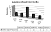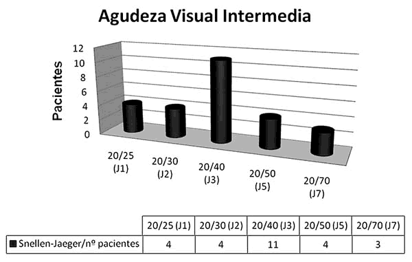 En cuanto a la distancia intermedia el resultado visual medio fue 20/40 o J3 (P<0,01) (tabla 4). En 8 casos se constató una agudeza visual entre 20/25 y 20/30 (J1-J2), en 11 ojos el resultado fue 20/40 (J3), 4 ojos mostraron una agudeza de 20/50 (J5) y sólo en 3 casos la agudeza fue igual o peor a 20/70 (J7). En este caso 19 de los 26 ojos (73%) estaban en agudezas visuales iguales o mejores a J3 (fig. 4).