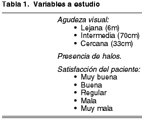 Diseñamos un estudio prospectivo, no comparativo, con el fin de evaluar la agudeza visual lejana (6 metros), cercana (33 cm) e intermedia (70 cm), la presencia de aberraciones visuales tipo halos, así como la satisfacción de los pacientes (entendida ésta como la comodidad y la sensación de independencia de gafas percibida por el paciente al realizar sus tareas habituales) (tabla 1). Se utilizaron para el estudio las variables recogidas a los 6 meses de la implantación de la lente intraocular.