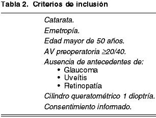 Los pacientes fueron seleccionados considerando los siguientes criterios de inclusión (tabla 2): presencia de catarata sin síndrome pseudoexfoliativo asociado, edad mayor de 50 años, ojo emétrope, ausencia en los antecedentes de glaucoma, uveítis o patología retiniana, agudeza visual lejana previa a la cirugía inferior a 20/40, cilindro queratométrico previo inferior a 1 dioptría, capacidad para entender y firmar el consentimiento informado.