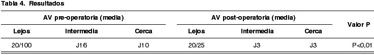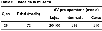 Se seleccionaron 26 ojos de un total de 22 pacientes. Puesto que el objetivo de este estudio es analizar los resultados funcionales obtenidos en cada ojo por separado se decidió incluir cuatro pacientes a los que se les había practicado cirugía en ambos ojos. La edad media de los pacientes fue de 72 años con una desviación estándar de ±9 años. La agudeza visual preoperatoria media fue 20/100 para larga distancia. J10 para distancia cercana y J16 para distancia intermedia (tabla 3).