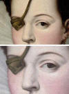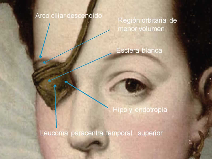 El Dr. Marañón al estudiar los cuadros de la Casa del Infantado llega a la conclusión de que se trata de una «nube externa o leucoma que da al ojo un peculiar aspecto lechoso» (8) ya que podría traslucirse desde el parche. Realmente no se aprecia claramente un leucoma ya que la tela no es del todo transparente e impide ver esta lesión, aunque parece que en uno de los cuadros se presenta en el sector corneal temporal (fig. 6).