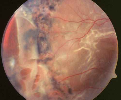 DESPRENDIMIENTO DE RETINA. MÚLTIPLES DESGARROS RETINIANOS. EVERSIÓN RETINIANA. SE ASOCIAN MÚLTIPLES AGUJEROS SUPERIORES E INFERIORES.