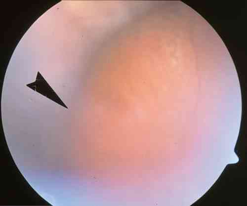 RETINA REAPLICADA DESPUÉS DE LA EXTRACCIÓN DEL PPCL. NÓTESE LA INDENTACIÓN DEL CERCLAJE (PUNTA DE FLECHA).