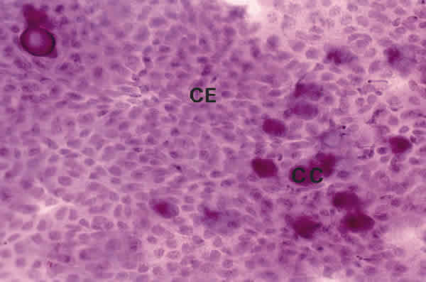 CITOLOGÍA DE IMPRESIÓN EN UN PACIENTE CON QCS-GRADO 1. LA DENSIDAD DE CÉLULAS CALICIFORMES (CC) ES MENOR QUE EN LOS CONTROLES. LAS CÉLULAS EPITEALIALES (CE) SON MAYORES Y LIGERAMENTE SEPARADAS. TINCIÓN PAS-HEMATOXILINA. MAGNIFICACIÓN ORIGINAL X40.