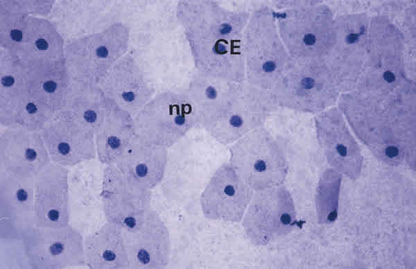 CITOLOGÍA DE IMPRESIÓN EN UN PACIENTE CON QCS-GRADO III. LAS CÉLULAS CALICIFORMES SON MUY ESCASAS O HAN DESAPARECIDO. LAS CÉLULAS EPITELIALES (CE) ESTÁN SEPARADAS, SON GRANDES Y PRESENTAN ALTERACIONES NUCLEARES, PRINCIPALMENTE PICNOSIS (NP). TINCIÓN PAS-HEMATOXILINA. MAGNIFICACIÓN ORIGINAL X40.