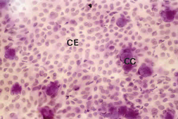 CITOLOGÍA DE IMPRESIÓN EN UN PACIENTE CON SS1-GRADO I. EL NÚMERO DE CÉLULAS CALICIFORMES (CC) ES MODERADO Y LAS CÉLULAS EPITELIALES (CE) SON PEQUEÑAS Y ESTÁN LIGERAMENTE SEPARADAS. TINCIÓN PAS-HEMATOXILINA. MAGNIFICACIÓN ORIGINAL X40.